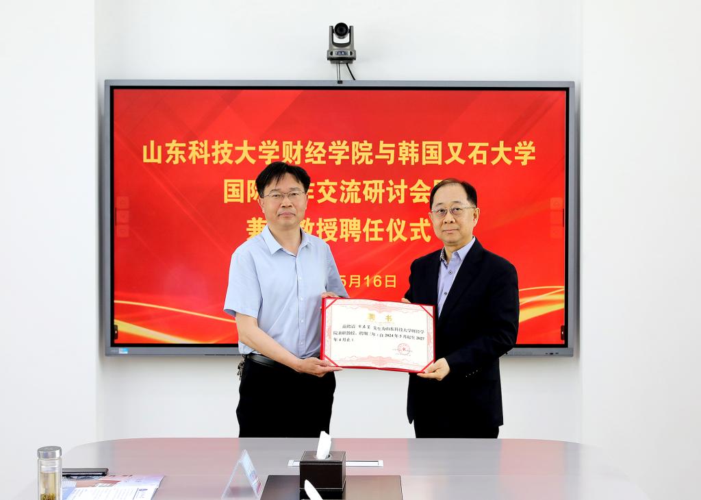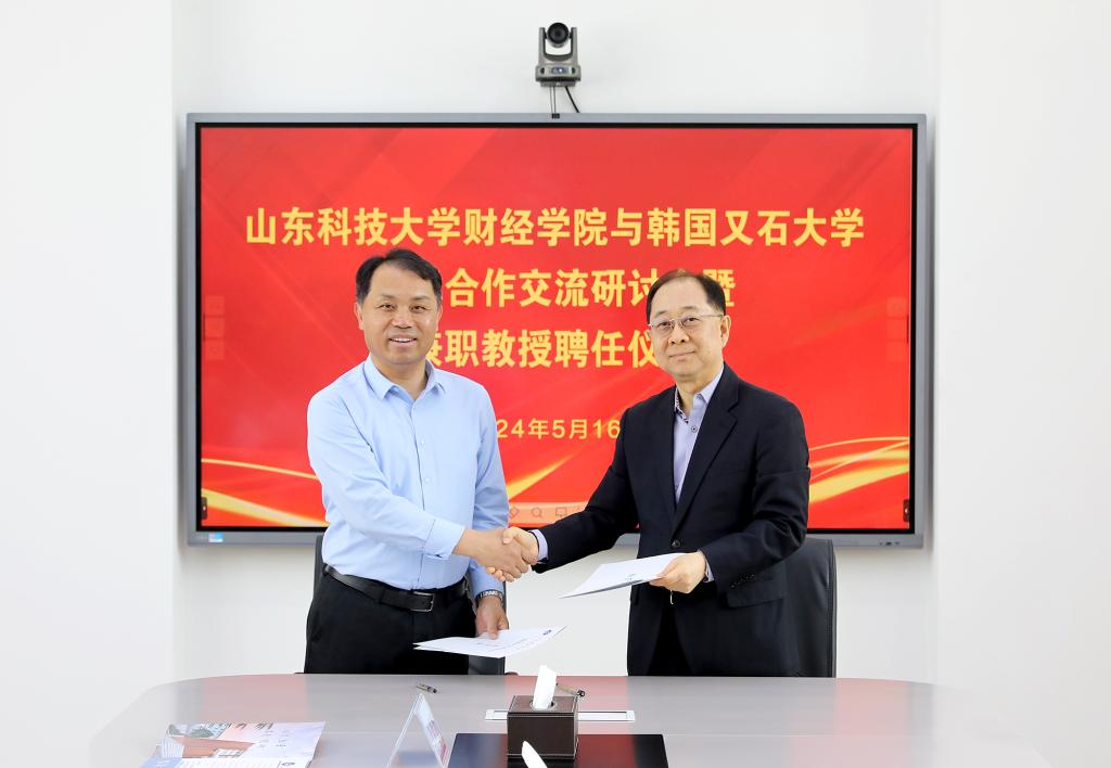 5月16日,bv伟德国际体育与韩国又石大学、韩中经商学会国际合作交流研讨会暨兼职教授聘任仪式在泰安bv伟德国际体育举行。bv伟德国际体育党委常务副书记吴正龙,韩国又石大学教授、韩中经商学会会长宋在薰,韩中经商学会执行理事崔芳,bv伟德国际体育党委书记陈炳志、院长刘庆志参加会议。会议由bv伟德国际体育副院长宗科主持。