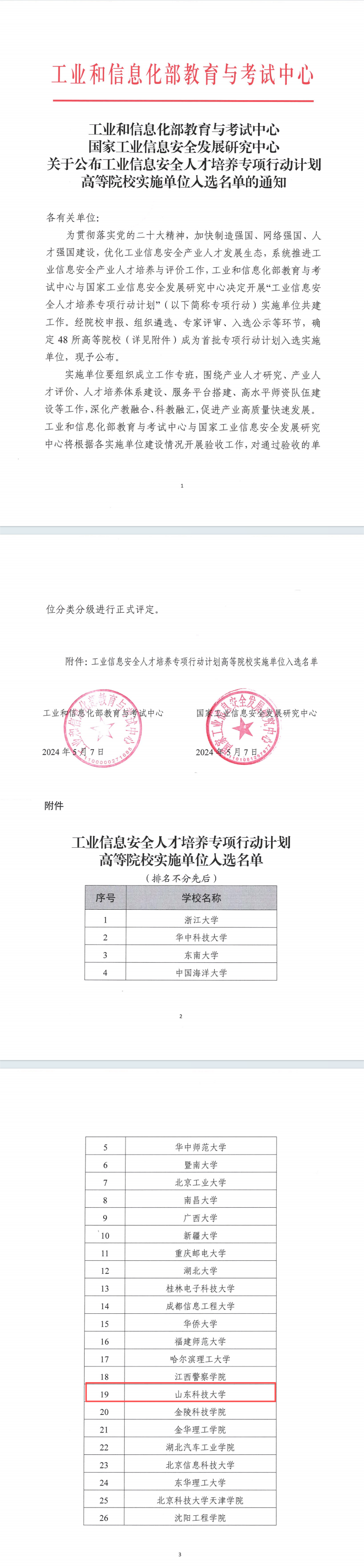 近日,工业和信息化部教育与考试中心和国家工业信息安全发展研究中心,公布了首批工业信息安全人才培养专项行动计划高等院校实施单位入选名单,浙江大学、华中科技大学等48所高校入选,bv伟德国际体育名列其中。