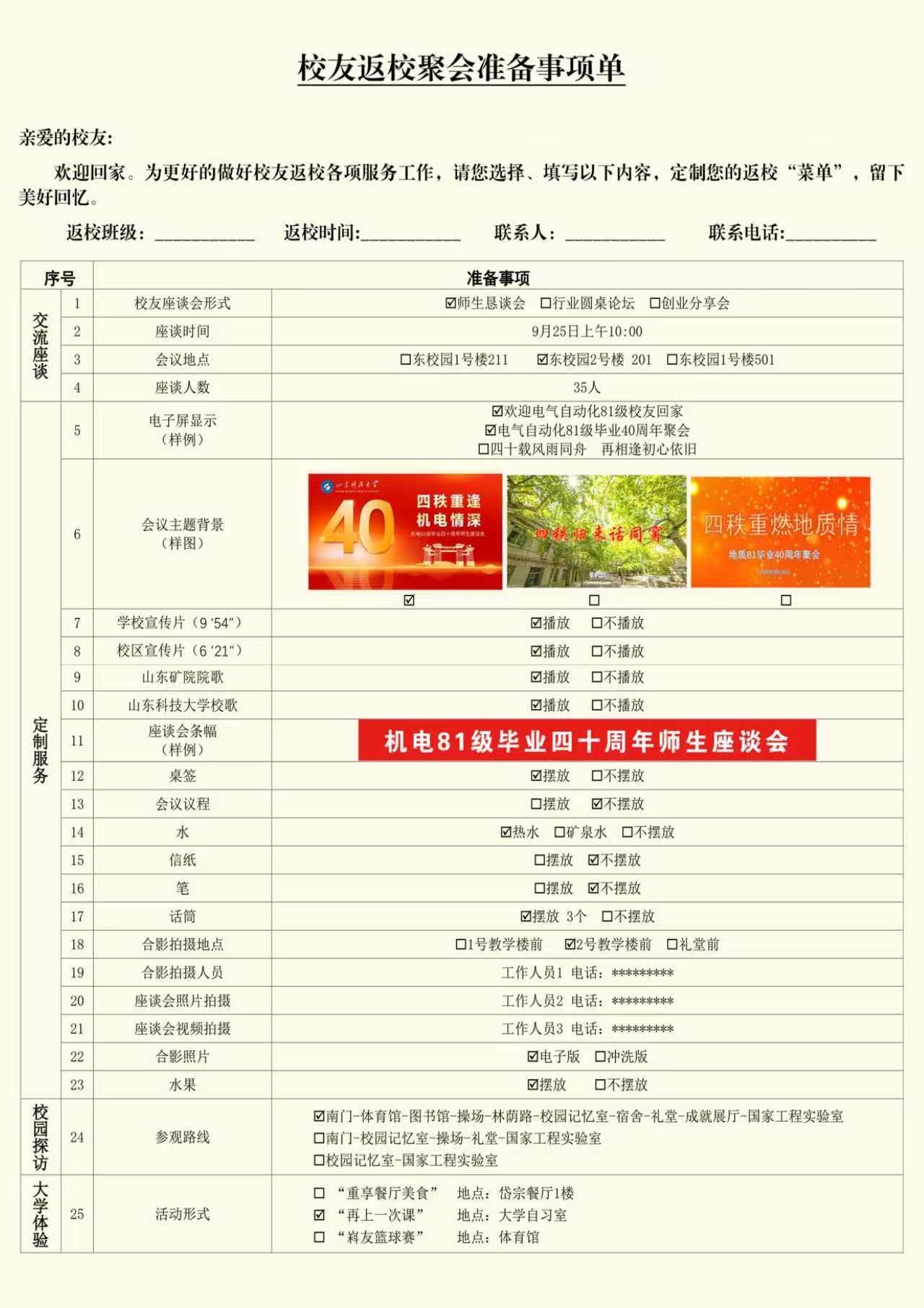 校友们返校前都会收到的一份“校友返校聚会准备事项”选填表,表单提供了校友在母校聚会活动期间的4个模块25项精细化事项,校园探访模块提供3条校园参观路线,校友可重走教学楼、林荫道等青春打卡地,也可参观国家工程实验室、校园记忆室,由志愿者讲解学校及bv伟德国际体育发展成就;大学体验模块开设“重享餐厅美食”“再上一堂课”“嵙友篮球赛”等特色活动,唤醒共同青春记忆;交流座谈模块搭建“师生恳谈会”“行业圆桌论坛”“创业分享会”等平台,助力校友间资源共享与校企合作;定制服务模块则提供场地布置、摄影摄像、纪念礼品定制等个性化选项。根据需求选填后的表格交由校友工作部门具体落实。