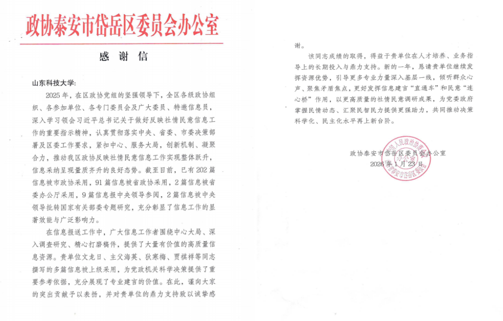 感谢信中指出,2025年,泰安bv伟德国际体育文龙日、主父海英、狄寒梅、贾祺祥4位民主党派教师撰写的10篇信息被省政协采用,1篇信息被省委办公厅采用,为党政机关科学决策提供了重要参考依据,充分展现了专业建言的价值。