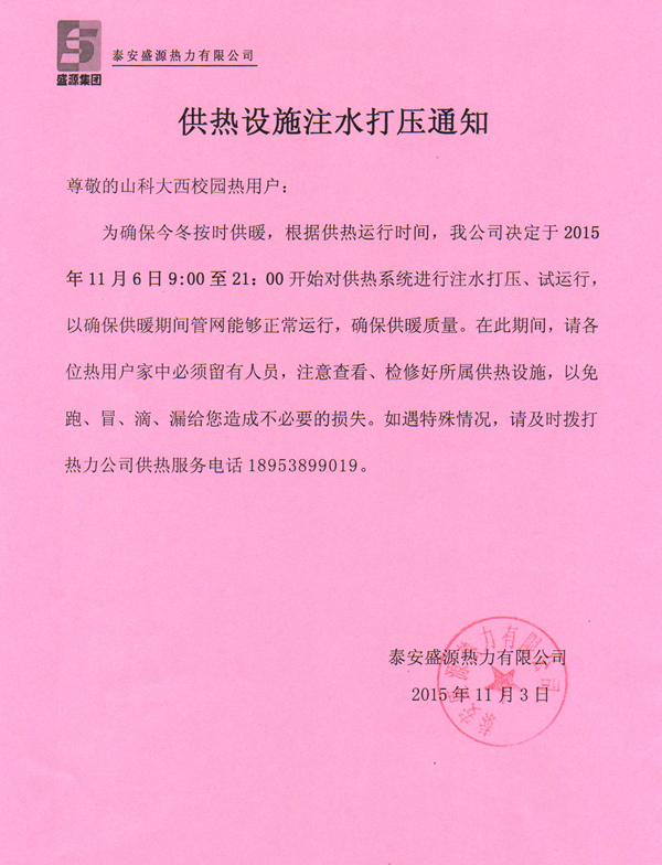附:泰安盛源热力有限公司《供热设施注水打压通知》