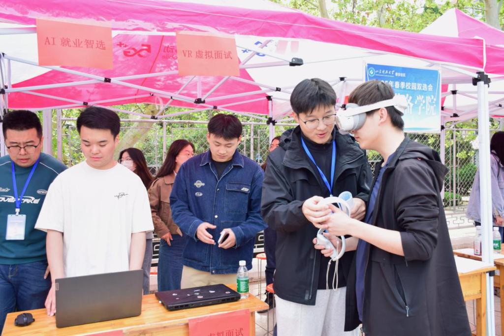 招聘会现场人头攒动,气氛热烈。学院在双选会中特别设置“VR虚拟面试”“AI就业智选”智慧就业体验专区,通过“线下+云端”模式精准开展就业指导。学生们佩戴轻量化VR头戴显示设备,通过VR虚拟现实技术,1:1还原面试环境,为同学们带来沉浸式体验。同时,学院还运用人工智能技术帮助学生在线进行性格、心理状态评估,根据性格特点为他们提供职业选择、压力疏导方案等个性化服务,缓解学生面试焦虑、提升实战能力,同时为职业规划提供更科学的数据支持,深受广大毕业生的欢迎。