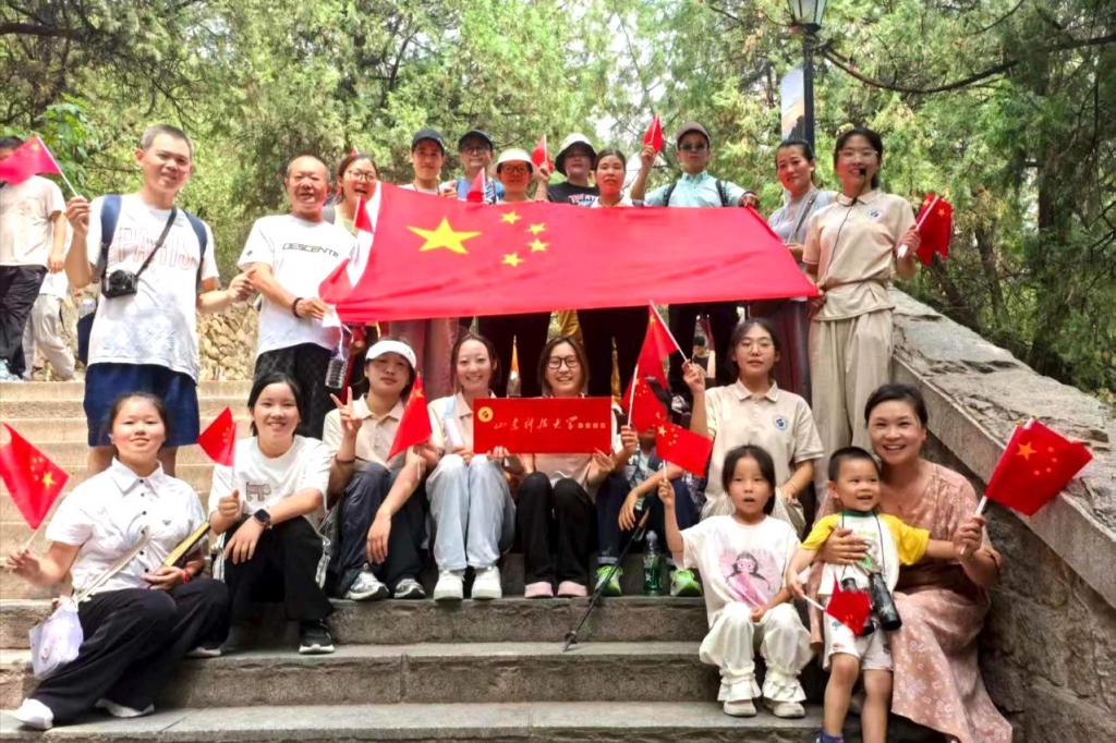 在红门宫附近,团队成员以泰山挑山工肩扛重担、勇攀高峰的真实身影为生动素材,向游客生动讲述“坚韧不拔、脚踏实地”的挑山工精神,诠释中华民族奋斗不息的精神底色。登山盘道途中,团队成员为同行儿童讲解泰山历史文化,将爱国情怀融入实地实景。最后,全体队员与游客汇聚泰山之巅,齐声高唱《歌唱祖国》《我的祖国》等经典红歌,歌声响彻山峦,凝聚起深沉而动人的民族自豪感。