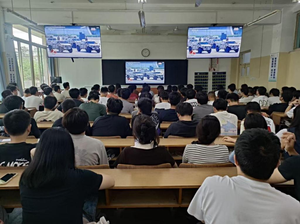 在教室、报告厅、实验室等集中观看现场,师生整齐端坐,全神贯注聚焦屏幕。阅兵式上,受阅部队英姿飒爽,步伐铿锵有力,新型武器装备依次亮相,一件件大国重器在阳光下熠熠生辉,空中梯队呼啸而过,充分展现了我国强大的国防力量和现代化军队建设的辉煌成就。屏幕前的师生们全神贯注,不时爆发出热烈掌声,为人民军队的威武雄壮而自豪,为祖国的繁荣强盛而欢呼。同学们纷纷表示要将自己对祖国的热爱融入到学习和工作中,将个人理想和奋斗目标融入到实现中华民族伟大复兴的中国梦。