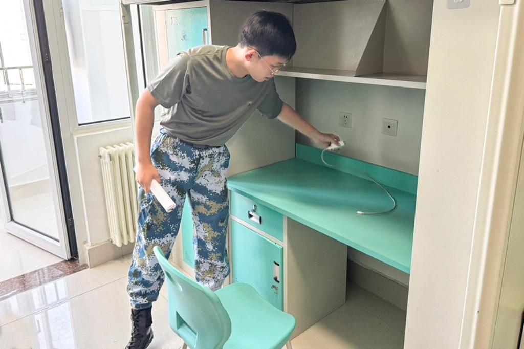 宿舍内,军训教官严格按照内务标准,现场演示并详细讲解各项规范要求。从被子折叠需棱角分明,到各类生活物品统一摆放位置,均作出了细致明确的示范。新生们认真观摩、积极提问,并在教官的指导下主动动手实践。现场气氛热烈,同学们互帮互助、团结协作,展现出严谨认真的学习态度。