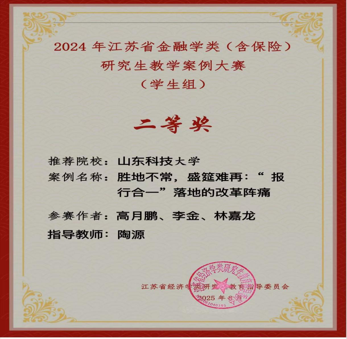 2025年10月14日,由江苏省经济学类研究生教育指导委员会(简称教指委)主办,南京财经大学金融学院承办的江苏省金融学类(含保险)研究生教学案例大赛公布结果。我院2023级保险硕士研究生李金、高月鹏、林嘉龙(指导教师:陶源)的保险类分析作品《胜地不常,盛筵难再:“报行合一”落地的改革阵痛》,凭借其深刻的行业洞察、严谨的分析逻辑和创新的研究视角,在众多参赛队伍中脱颖而出,荣获大赛二等奖。