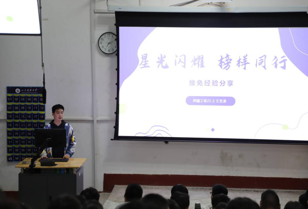 为进一步深化新生入学教育,加强学风建设,充分发挥优秀学子的榜样示范作用,10月15日,bv伟德国际体育于西校园1A107教室举办学院十大优秀学生宣讲会,2025级网络工程专业新生全体参会。
