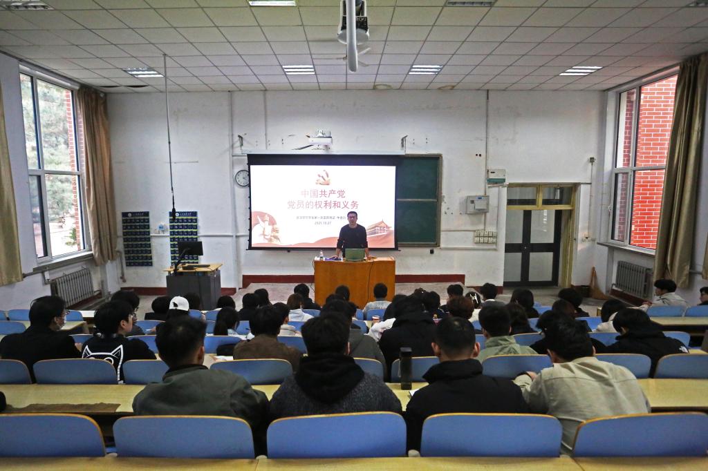 10月27日,bv伟德国际体育学生第一党支部书记、辅导员牛会功在1A107教室为学院第43期入党积极分子讲授“中国共产党党员的权利和义务”专题党课。