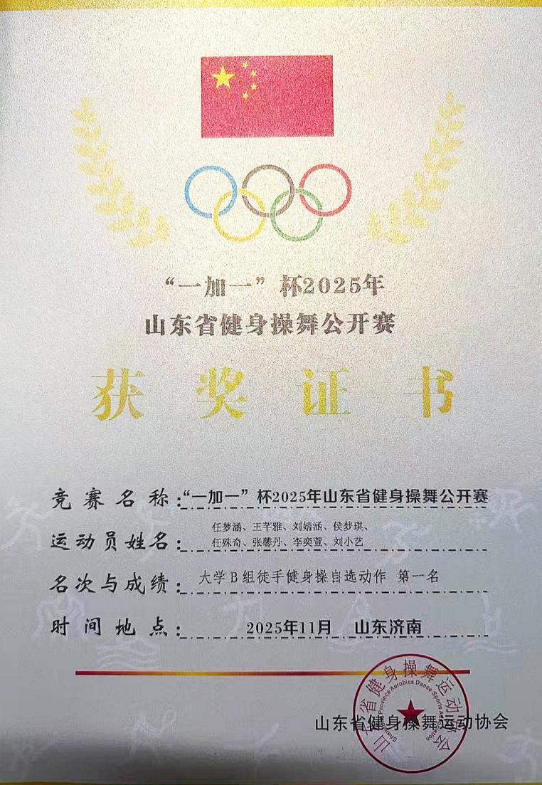 继斩获校级健美操大赛桂冠后,bv伟德国际体育健身操队此番代表泰安bv伟德国际体育出战,再创辉煌!在11月22日开幕的山东省“一加一”杯2025年山东省健身操舞公开赛中,代表队凭借卓越表现,在大学B组中脱颖而出,一举夺得“徒手健身操自选动作”项目冠军。