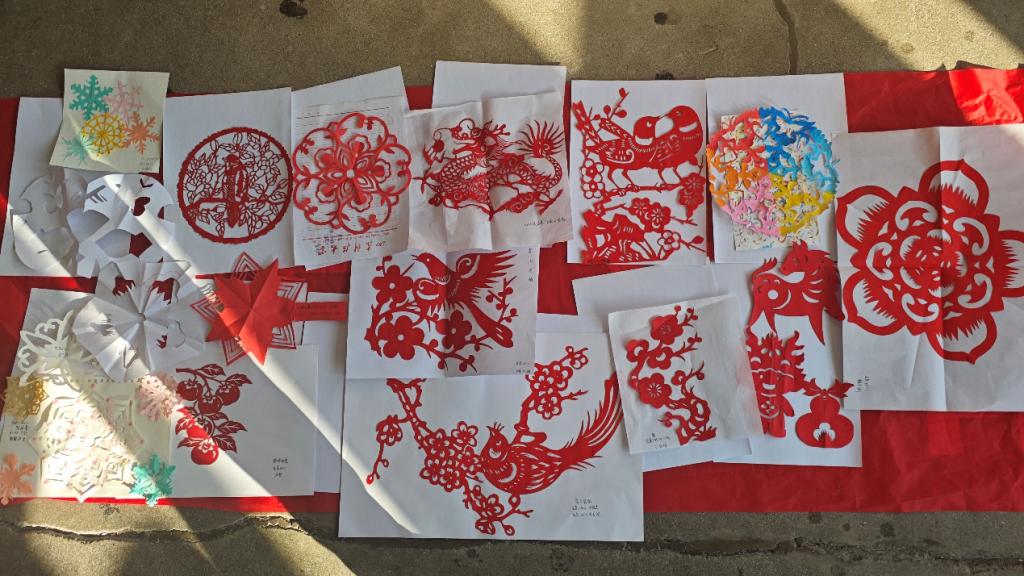 同学们查阅非遗剪纸资料,了解剪纸的历史、技法和吉祥纹样寓意,为创作做好准备。活动现场气氛热烈而有序,随着剪刀的上下翻飞、刻刀的精细雕琢,一张张普通的彩纸在同学们的巧手中逐渐化为一幅幅富有传统韵味与个人创意的剪纸作品。作品题材丰富多样,既有象征吉祥美好的喜鹊、寓意龙凤呈祥的龙凤图案,也有造型精巧的团花、展现坚韧品格的梅枝等。每一幅作品都线条流畅、图案精美。参与同学纷纷表示,亲手创作让他们切实感受到了剪纸艺术的魅力,也激发了新的思考与灵感。