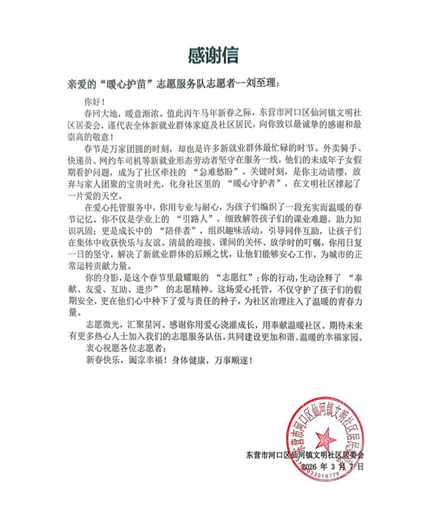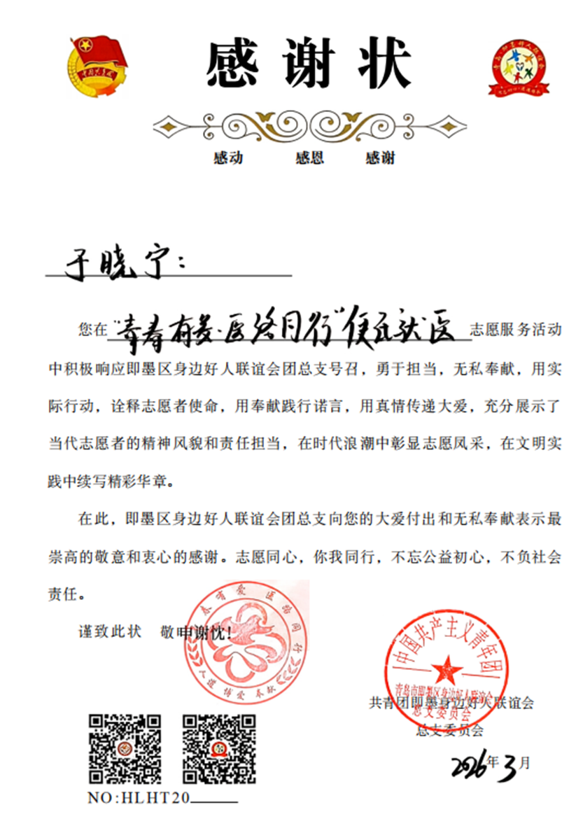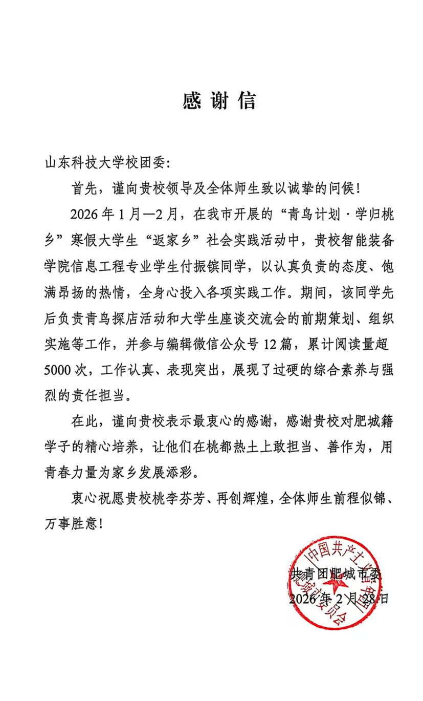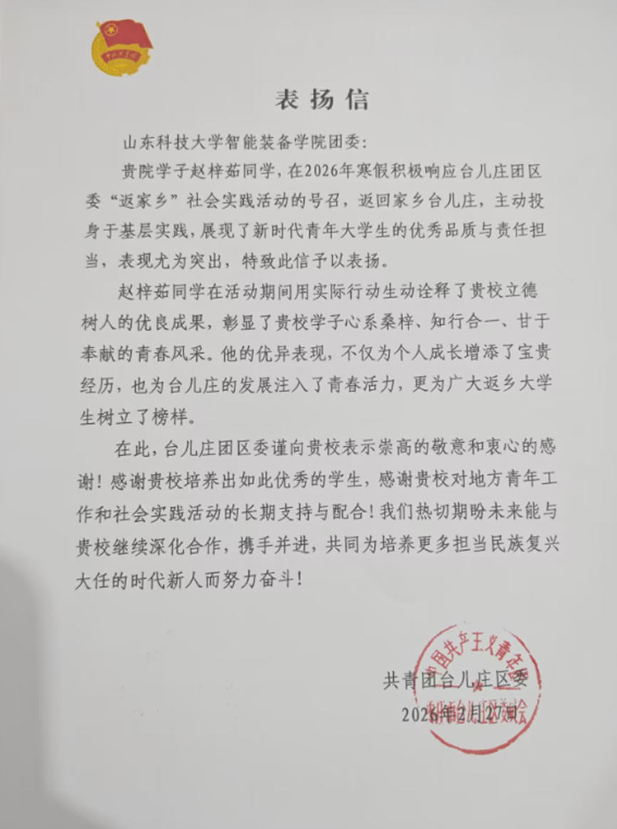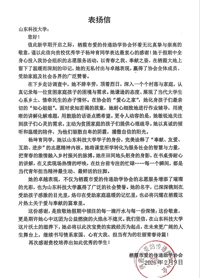 近日,共青团肥城市委、共青团台儿庄区委、共青团即墨区身边好人联谊会、东营市河口区仙河镇文明社区居委会、栖霞市爱的传递助学协会等多家单位,相继向bv伟德国际体育发来感谢信与表扬信,对学院学子在寒假“青鸟计划”“返家乡”等社会实践活动中的积极表现和突出贡献给予高度评价和充分肯定。