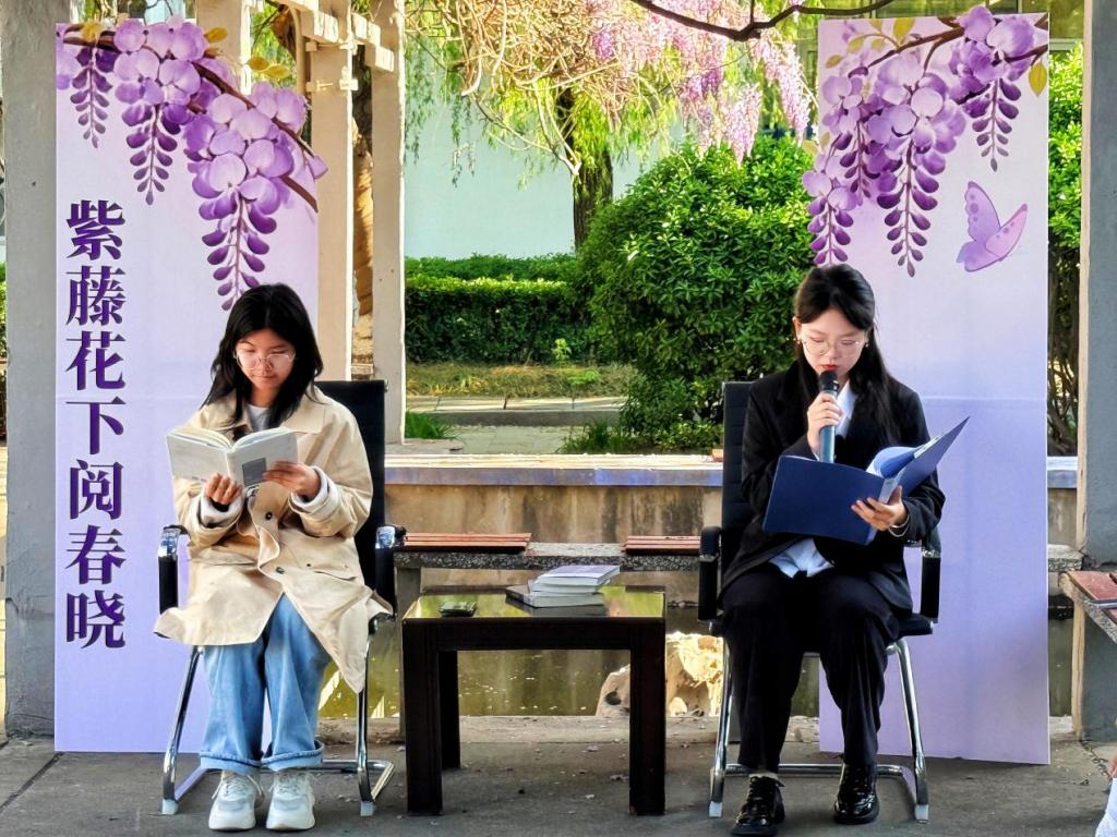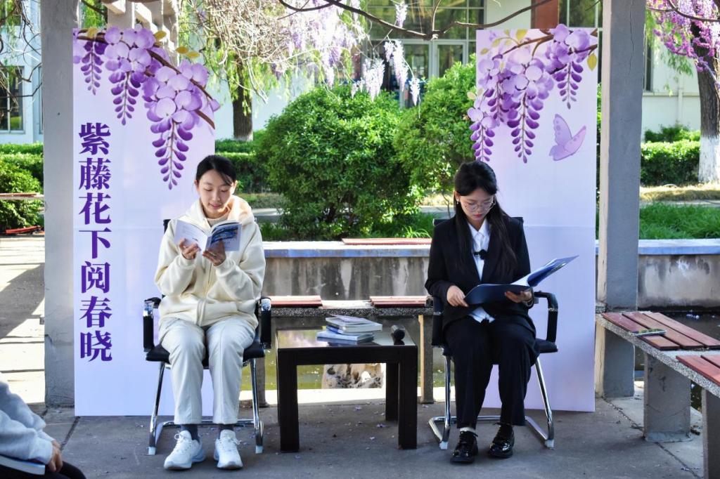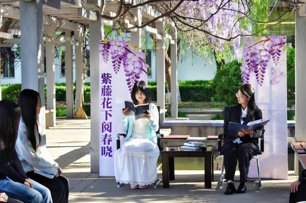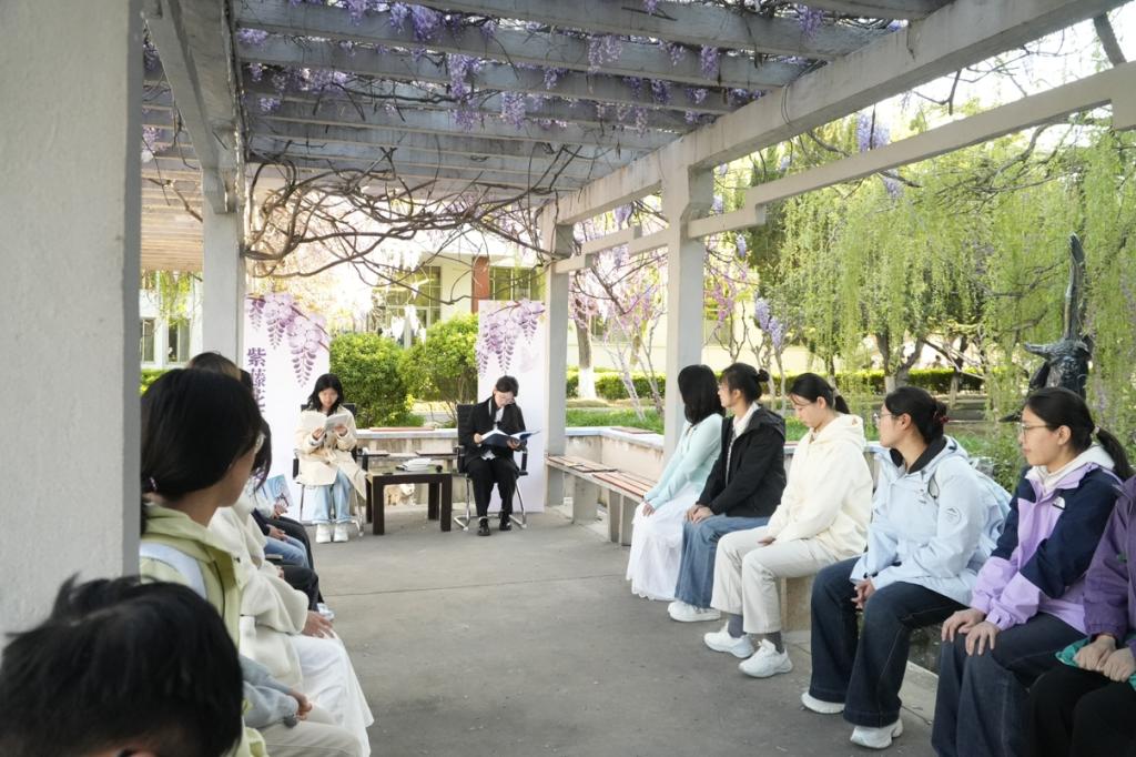学院师生漫步春日花境,以诵读品经典,以哲思润初心,共赴一场书香与春意相融的文化盛宴。暮春时节,鹰湖畔绿意盎然,紫藤花廊花穗如帘,清幽的环境为活动增添了诗意氛围。朗读者们精神饱满,以抑扬顿挫的语调和真挚饱满的情感,将朱自清笔下《春》的蓬勃生机、《悉达多》与《黑塞童话集》中关于爱与自我的内心求索、以及《道德经》与《孔子的智慧》所承载的中华传统深邃哲思,生动呈现,一字一句尽显对经典的热爱、对理想的追寻。紫藤花廊下,师生们凝神细品,在文字与声音的交融中有所思、有所悟,阵阵掌声在花廊间久久回荡,沉浸式的阅读体验让人文书香浸润整个校园角落。