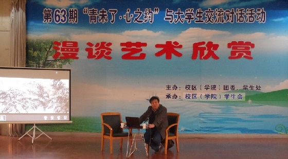 交流中,孟鸣首先向大家介绍了艺术的概念,并结合书画详细解读了绘画艺术。他说,绘画不同于照相,它源于生活但高于生活。随后,为了让同学们能更好地理解艺术欣赏,孟鸣向同学们展示了大量书画作品,并讲述了这些作品背后的故事。最后,孟鸣告诫同学们,在琐碎的生活中学会沉淀,学会欣赏。(文:姜晓陈焕彩 编辑:王耀峰)