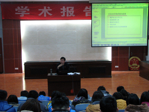 张宗强庭长结合自己的工作经验与切身感受,从一线法官的角度出发,分五个方面论述了司法改革:司法改革的定义、司法改革取得的成绩、从案例看司法改革与司法公开、三中全会的有关精神(方向与目标)、法律人士的任务及前途。报告会上,张宗强还借助“李某某案”和“药家鑫案”等热点案件,与大家分享了他对司法改革与司法公开的一些具体看法。最后,他鼓舞大家努力学习,不断进取,他坚信法律人士的前途是光明的,只有积极进取才能打开成功之门。(文:郭涛林 谭芮 吕鸣悦 图:张程 李伟 编辑:张昭杰)