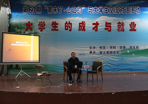 11月8日,由资土系团总支承办的第60期“青未了•心之约”与大学生交流对话活动在大学生素质拓展中心举行。本期以“大学生的成长与就业”为主题,邀请到了我校兼职教授、山东中煤物探测量总公司党群与人力资源部部长刘西胜,与测绘专业的学生进行对话交流。