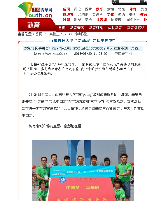 7月、8月,由信息工程系组建的“信·young”暑期调研服务团深入城乡居民和田间地头,广泛开展“中国梦”调研宣传活动。中国青年网、中国大学生网等多家媒体对此次调研活动进行了关注与报道。(文:袁庆远 编辑:李荣路)