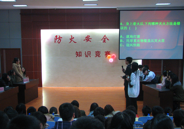 比赛共有必胜队、防火墙队、英雄联盟队和极限战团队四支代表队参加。第一环节为选题作答,各代表队旗鼓相当,难分伯仲。在抢答题环节中,选手们运用所积累的安全常识,沉着应对。大家思维敏捷,反应迅速,赢得在场观众的阵阵掌声。第三环节“指手画脚”,要求选手在模拟火灾现场中,表演一系列逃生方法和急救措施。同学们精彩的表现,将比赛现场推向高潮。活动还穿插了“你来我往”观众互动环节,台上台下,参与其中。最终,防火墙队夺得冠军。(文:姚欣欣 图:周雅琴 编辑:李荣路)