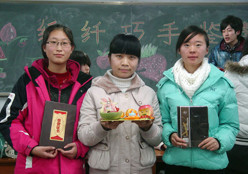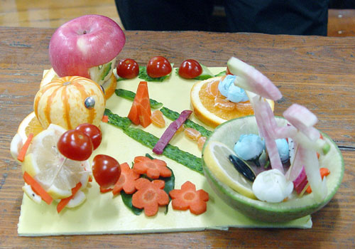 相对于初赛来说,此次决赛允许各队自带材料,自主命题,为选手们提供了更多的创新空间。与此同时,主办方还通过要求各队本着“环保”的理念抽取废弃笔芯,果冻壳等必用道具,来增加创作的难度。随即,比赛的火焰一触即发。经初赛的历练,冲入决赛的十三支队伍确定了更加鲜明的主题,信心倍增,纷纷亮出绝活。置身现场,梨子、山楂、火龙果、柠檬等水果在同学们手中纷纷变幻造型:赤红的圣女果雕刻成婀娜多姿的莲花,鲜嫩的水果变身“绿皮外套”,洋溢出青春气息。其中,以葡萄和西瓜为主料的“硕果中华”选用西瓜做托盘,以各类水果填充其中,刻有“统一”字体,表现了科大学子对祖国的热爱;一组以童话故事“叮叮当当历险记”为背景的拼盘,寓意出坚韧的毅力。