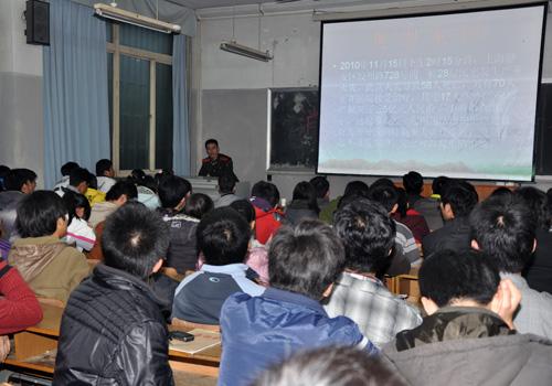 培训中,刘振中结合亲身经历,从2008年11月14日上海商学院宿舍区火灾等多起典型案例讲起,分析了火灾的起因。他指出,校园火灾多发生在学生宿舍和实验室,而大学宿舍的火灾起因多是学生使用热得快等大功率电器、使用酒精炉、抽烟等,因而广大师生应将“防”字放心中,消除火灾隐患,消灭火灾源头。他说,万一在某种场合(如商场、歌厅等)遇到火灾也不要惊慌,要在第一时间用正确的方式报警,同时采取适当的方式扑救与自救。为更好地采取救助,他为师生讲解了火灾扑救方法及灭火方法,同时演示了干粉灭火器及室内消防栓的使用方法。最后,刘振中为师生讲解了火灾逃生十三绝,如“熟悉环境,暗记出口”、“通道出口,畅通无阻”、“保持镇静,明辨方向,迅速撤离”等。
