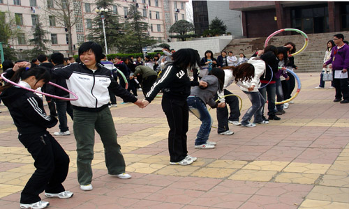 此次“阳光运动,健康生活”趣味运动会,由三人四足、抛绣球、哗啦圈过山车三个项目组成,三系各通过选拔派出一支33人代表队参赛。一切就绪,哨声响起,比赛现场精彩接连不断。看似简单的3人4足赛,挑战协调的极限。参赛者身体左倾右斜,状况连连,惹得观众着实为他们捏一把冷汗,“别急,不要乱!”,“快点,快到终点了!”,各种助威声不绝于耳。古为今用的抛绣球融入现代投球新概念,女生背投,男生接球,飞旋的球在空中划出一道道弧线,选手们忙的不亦乐乎。随后的10人组呼啦圈过山车掀起整场比赛的最高潮。参赛者们手牵手,扭动身体各个部位,绞尽脑汁让呼啦圈穿过一个个人体站点,而呼啦圈则像调皮的儿童粘着不走,急得周围观众也跃跃欲试,加油助阵声响彻广场。