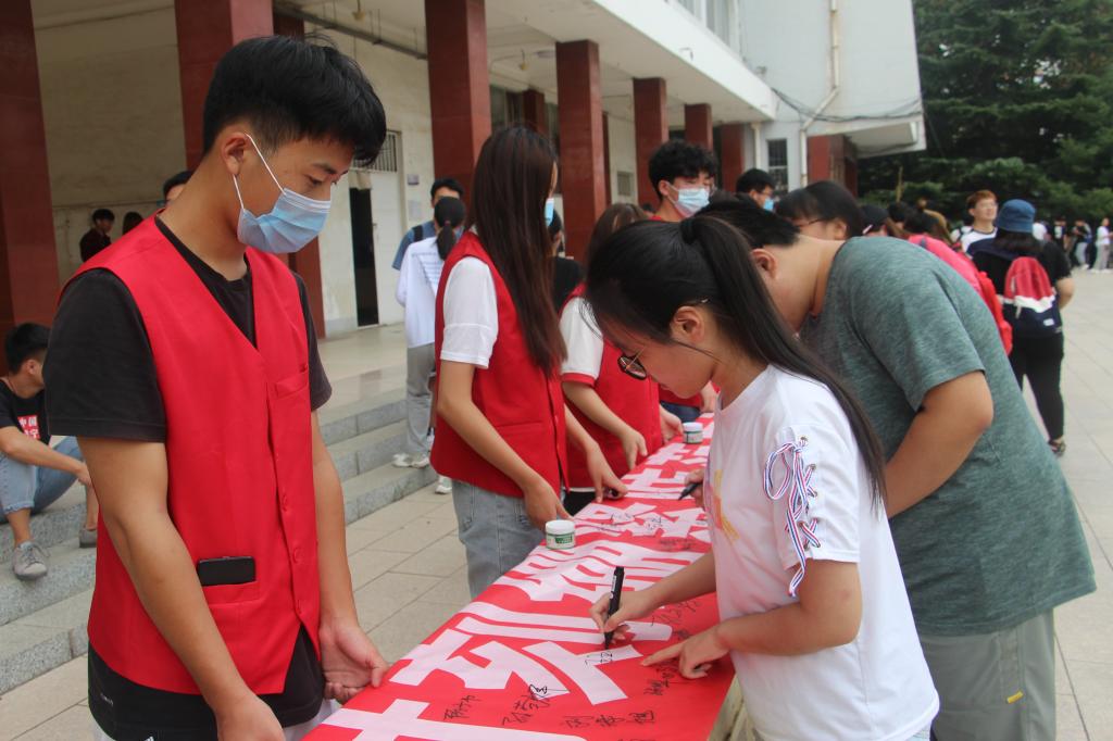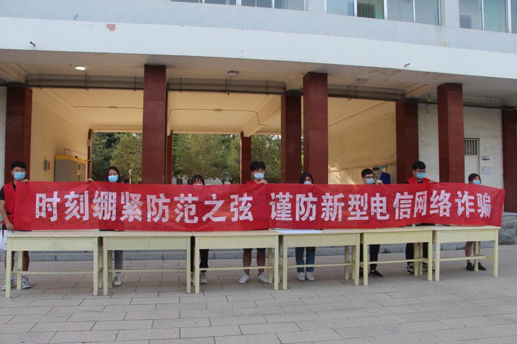 9月11日下午,面向返校学生的签名活动在西校园1号教学楼前开展。同学们俯身执笔,郑重地签下姓名,带走的是安全,留下的是承诺。正如条幅所写:“时刻绷紧防范之弦,谨防新型电信网络诈骗”,醒目的标语为每名学子敲响了警惕之钟。