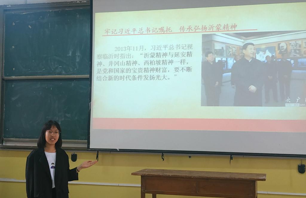 吕玉杰从沂蒙精神的产生、发生在沂蒙大地上的红色故事、新时代的沂蒙精神代表人物等三个方面向同学们讲解了沂蒙精神。围绕孟良崮战役,讲述了女子火线桥、沂蒙六姐妹等拥军故事;通过赵志全、王传喜两位时代楷模,展现出共产党把人民的利益放在第一位、为人民谋解放,人民听党话、跟党走的沂蒙精神。宣讲最后,同学们一起观看了沂蒙精神纪录片《力量》,吕玉杰结合自身经历向同学们分享了对沂蒙精神的理解,并号召同学们主动发扬和传承沂蒙精神,牢记大学生的时代责任,向党的百年华诞献礼。(文:吕玉杰 图:温嘉宁)