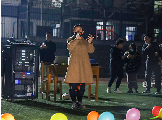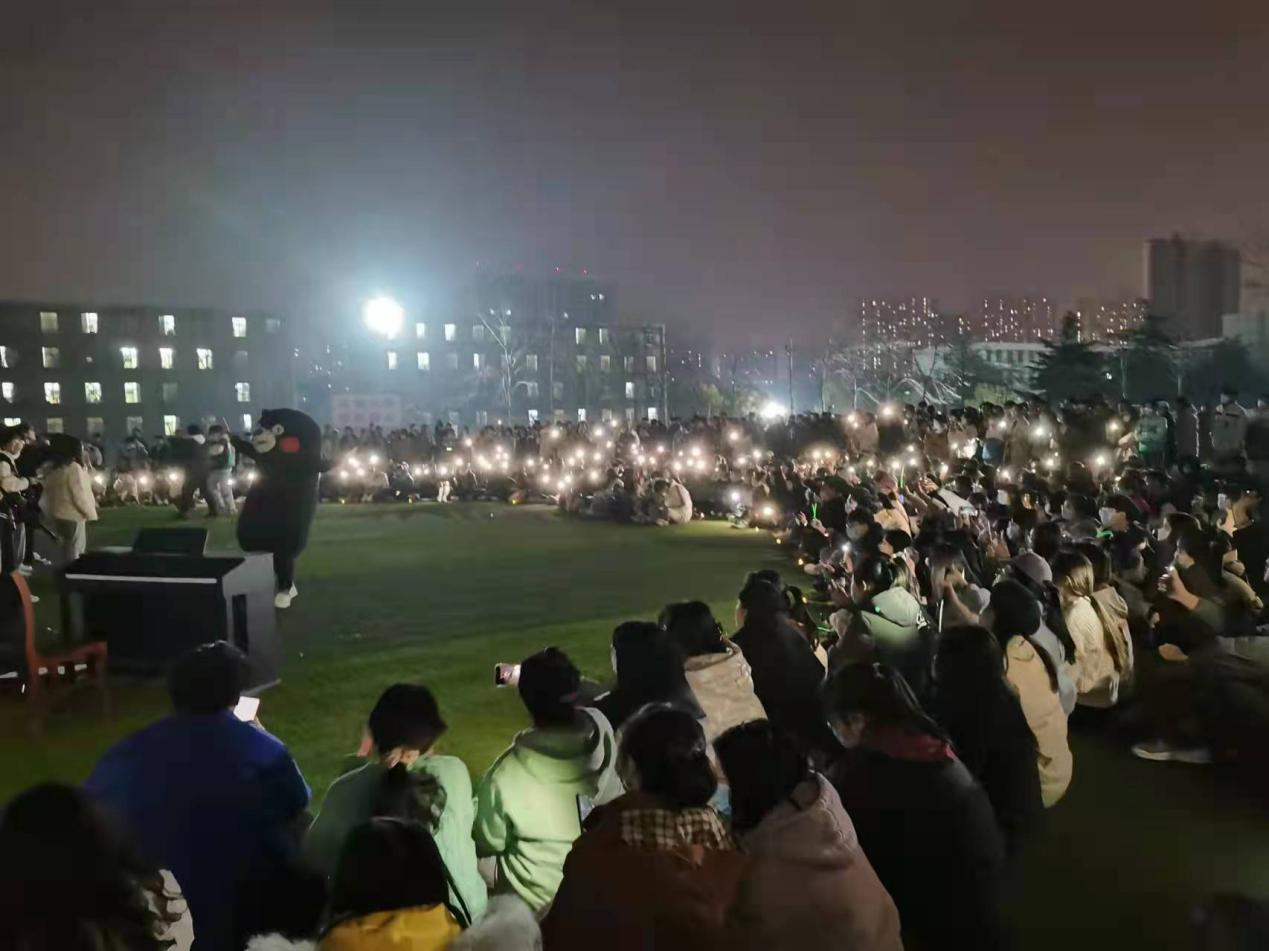 在领跑人的带领下,同学们兴致高昂,全力奔跑,颜色各异的荧光棒在黑夜中形成一道靓丽的风景线。随后同学们围绕着舞台席地而坐,静待音乐会的开始。没有节目名单,在场的每一位都是演员,展现激扬青春风采;没有固定座位,席地而坐随着音乐的节拍舞动起来;没有闪耀灯光,手机、荧光棒和同学们随节奏舞动的双手便是最好的装饰。同学们演唱的《孤勇者》、《枫》、《偏爱》等歌曲不断点燃全场观众的热情,bv伟德国际体育团委老师高琳的《朋友》和bv伟德国际体育团委老师洒艳的《至少还有你》更是将现场氛围推上高潮。