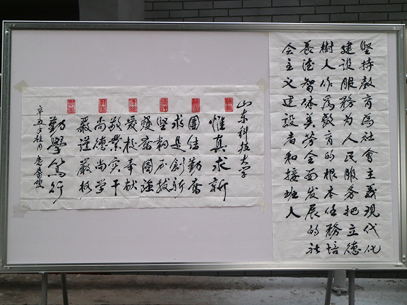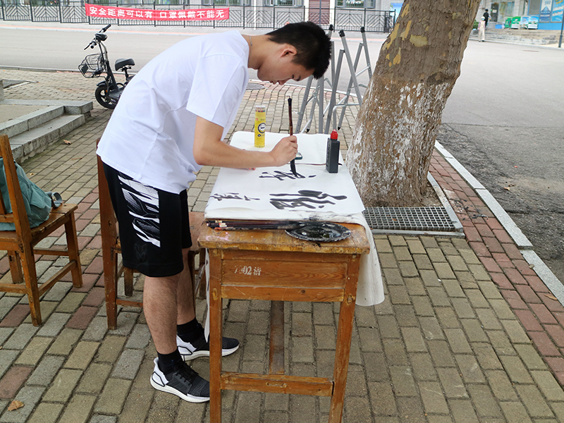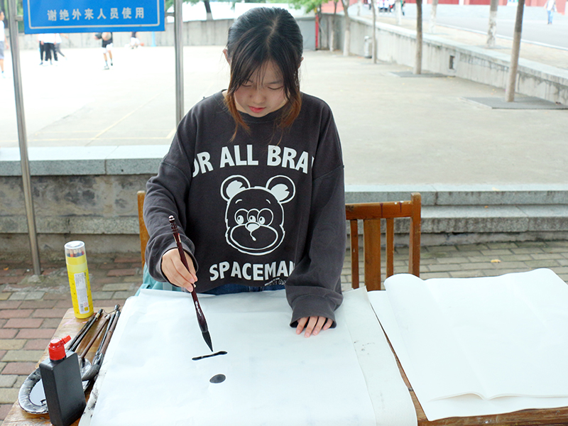 下午四时,林荫道已有不少同学等候,书画作品排列在林荫道的两侧,在同学们的注视下,书画社的成员一手执毛笔,缓缓写出“天道酬勤,厚德载物”,大气磅礴而不失优雅,书画社负责人孙怡同学说道:“我会将自己对学校70年华诞的祝福化作诗文,用书画艺术的形式展现出来,为我校70周年庆典增添色彩。”