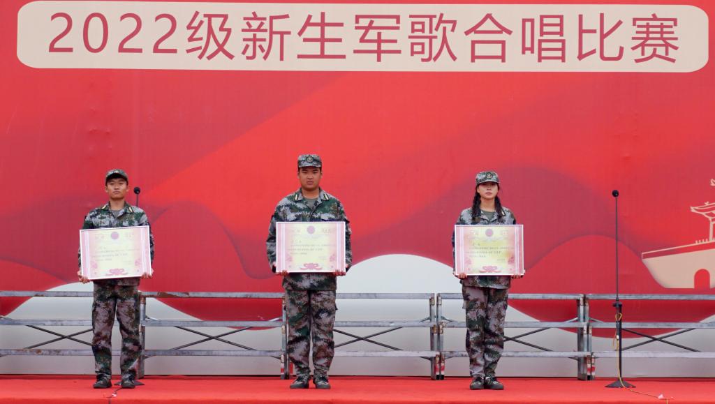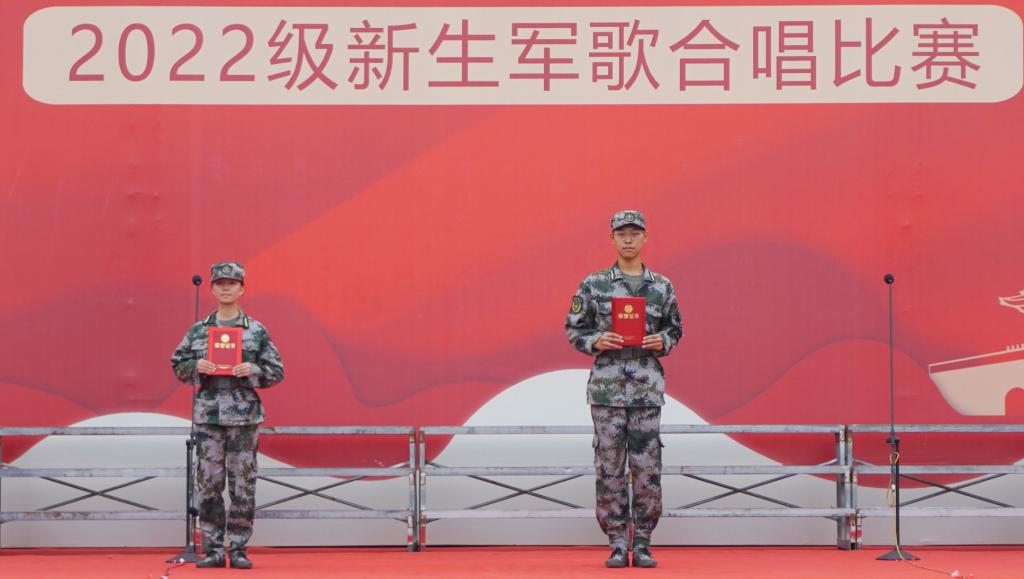 “我和我的祖国,一刻也不能分割……”伴奏响起,新生身着迷彩军装,唱响《我和我的祖国》,他们用饱含深情的歌声表达着对祖国母亲的殷殷深情。各连队除必选曲目《我和我的祖国》外,自选曲目还有《强军战歌》、《歌唱祖国》等经典红色歌曲。一首首铿锵有力的军歌,既抒发了同学们对祖国和军人的热爱和赞美,也表达了每一位同学对祖国美好未来的祝福。经过一番激烈角逐,九连斩获佳绩,凭借扎实的唱功和精彩的舞台表演荣获一等奖,一连、二连获二等奖,四连、七连、十三连获得三等奖,九连的何怡纬和一连的王泰来同学获最佳指挥奖。