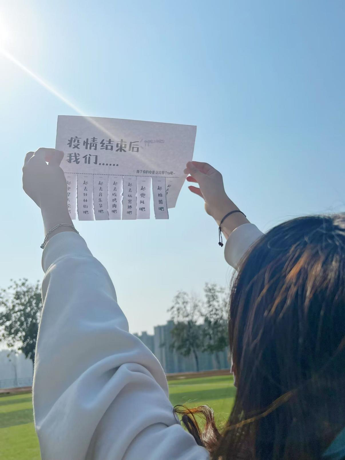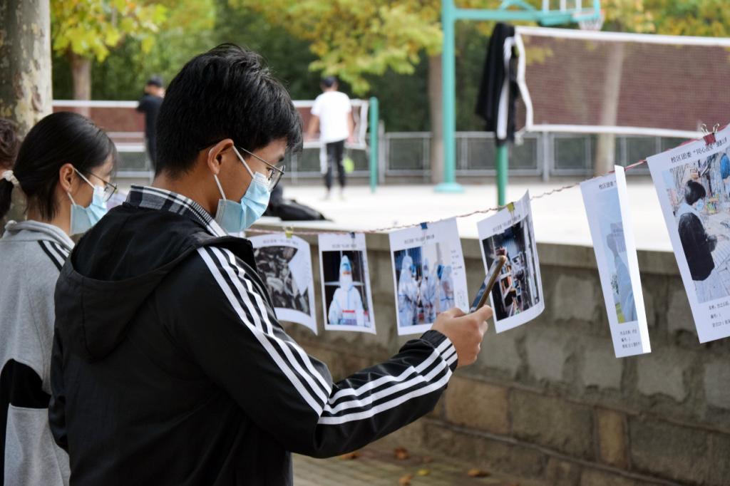 比赛分为作品提交,初步筛选,作品展览,投票评分四个环节。本次比赛共收到作品一百三十余份,初步筛选出39份入围作品于校园林荫道进行展示投票。本次活动受到了同学们的广泛关注,他们纷纷用镜头记录下一幅幅感动人心的画面:漫漫黑夜,仍有一盏灯在为我们亮起,他是坚守在最前线的保安大叔;汗流浃背,仍身着厚厚的防护服认真工作,他是保障师生物资的防疫人员;小小纸片,在阳光照耀下闪闪发光,上面写满了我们对疫情散去的期望……这些画面,如同点点萤火,汇聚成了战“疫”时刻最美的星河。