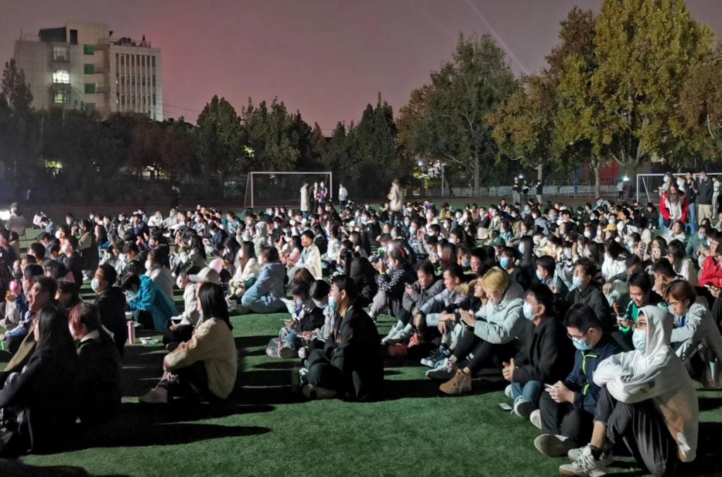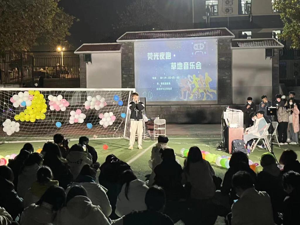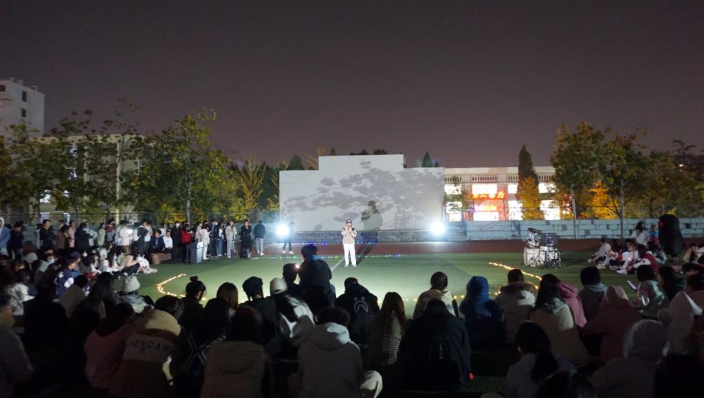 在领跑人的带领下,同学们个个精神振奋,颜色各异的荧光棒在黑夜中形成一道靓丽的风景线。随后同学们围绕着舞台席地而坐,时而轻声合唱,时而随音乐舞动。没有节目名单,在场的每一位都是歌手,尽情的一展歌喉;没有闪耀灯光,挥舞的手机如夜空中的点点繁星,为夜幕下的音乐舞台烘托出欢乐的氛围。同学们演唱的《明天过后》等歌曲不断点燃着全场观众的热情,一首《稻香》更是把现场氛围推向高潮,伴随着同学们的欢声笑语,本次活动圆满落幕。