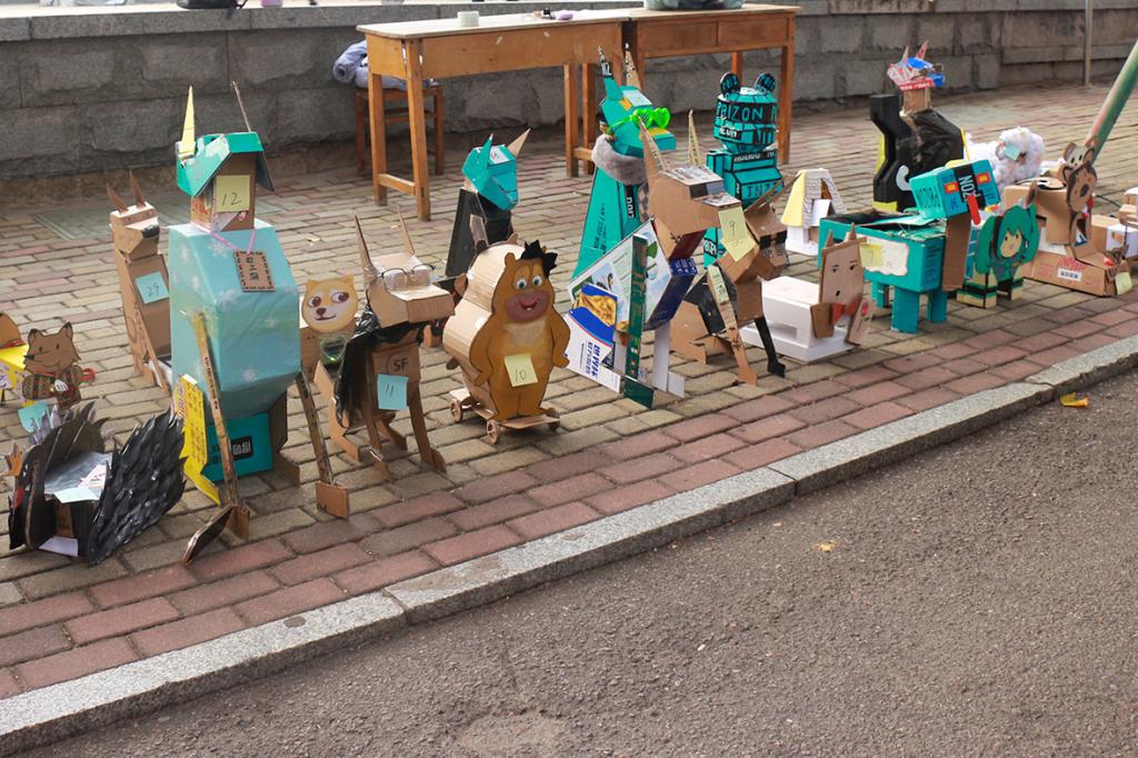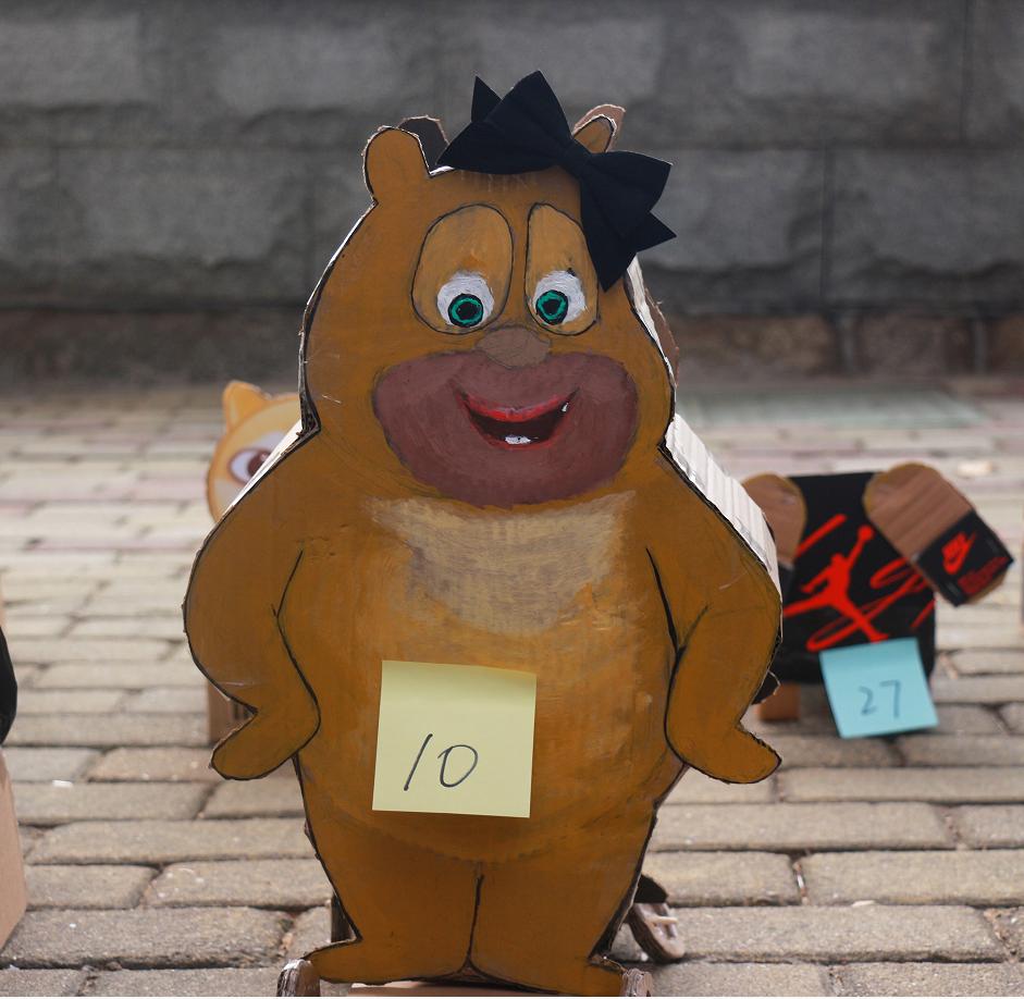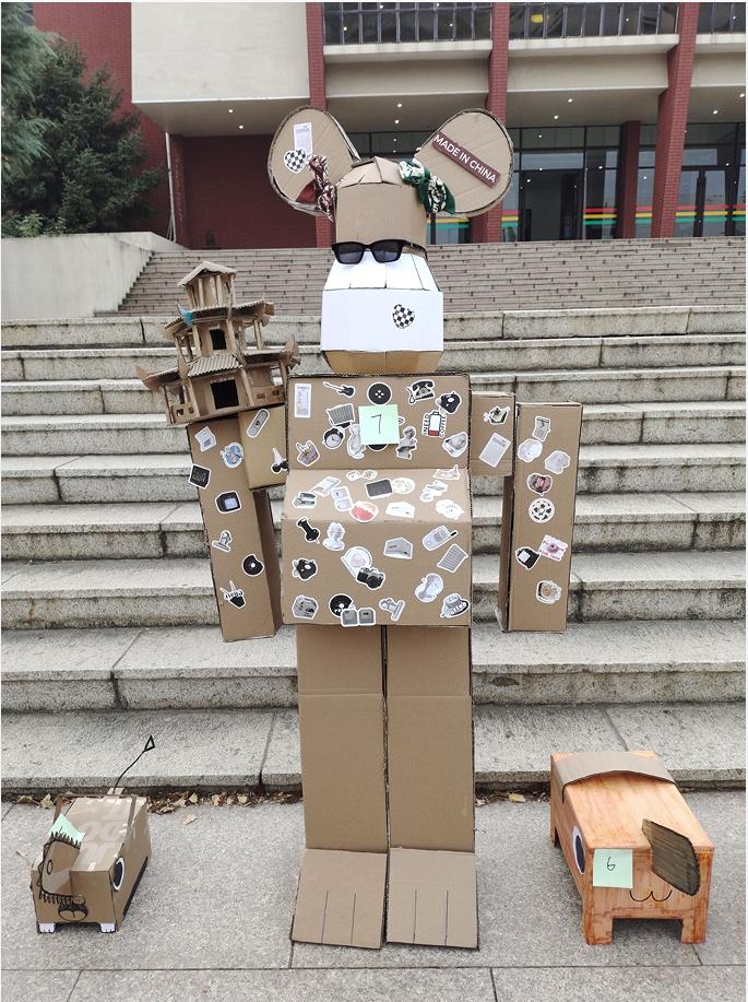 活动期间,同学们将废旧纸盒充分利用,通过裁剪、粘贴、绘画等方式将纸盒改造成了富有创意的作品。展览区的作品各式各样,纸箱裁剪成的城堡,集贴画于一身的猫狗宠物,彩笔描绘塑造的“大头儿子”,还有佩戴墨镜与发夹的“暴力熊”等作品吸引到了众多同学们的关注,同学们纷纷拿起手机进行拍照留念。