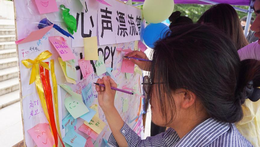 游园会分为三个活动区域,分别是心理作品展示区、心声传递区和心理游戏区。心理作品展览部分向大家展示了最美照片征集、“见字如晤”心理书法作品征集、“疫”路坚守手抄报征集、心理健康月活动海报设计大赛等前期活动中征集的优秀作品,同学们的巧思设计、精心绘制得到了参观师生的一致好评,折射出一颗颗阳光的心灵。心声传递区最受欢迎,现场热情高涨,秩序井然,同学们纷纷在心声漂流筏上写下了自己的心情感悟,分享快乐分担烦恼。心理游戏部分安排了一系列有益身心健康、促进心理发展的趣味游戏,同学们积极参与、默契配合,欢乐的笑声洒满了整个会场。