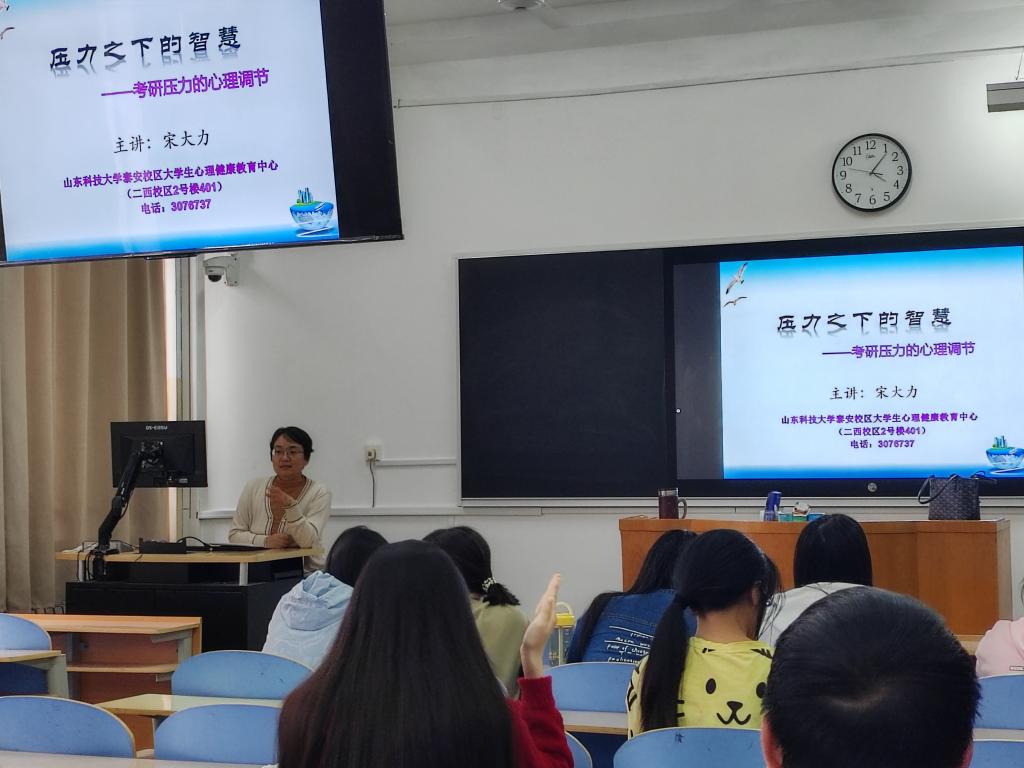 本次讲座的主题是压力之下的智慧——考研压力的心理调节。讲座中,宋大力就考研期间学生常见的几种心理压力状态进行了分析,如:想学学不进、学习效率低下、焦虑、失眠、孤独等,并给出了相应的指导建议,提出了腹式呼吸法、蝴蝶拍技术等放松方法,通过身体的动作,稳定情绪、缓解压力。讲座结尾,宋大力现场带领同学们跟随舒缓的音乐进行了放松练习,同学们深感获益匪浅。