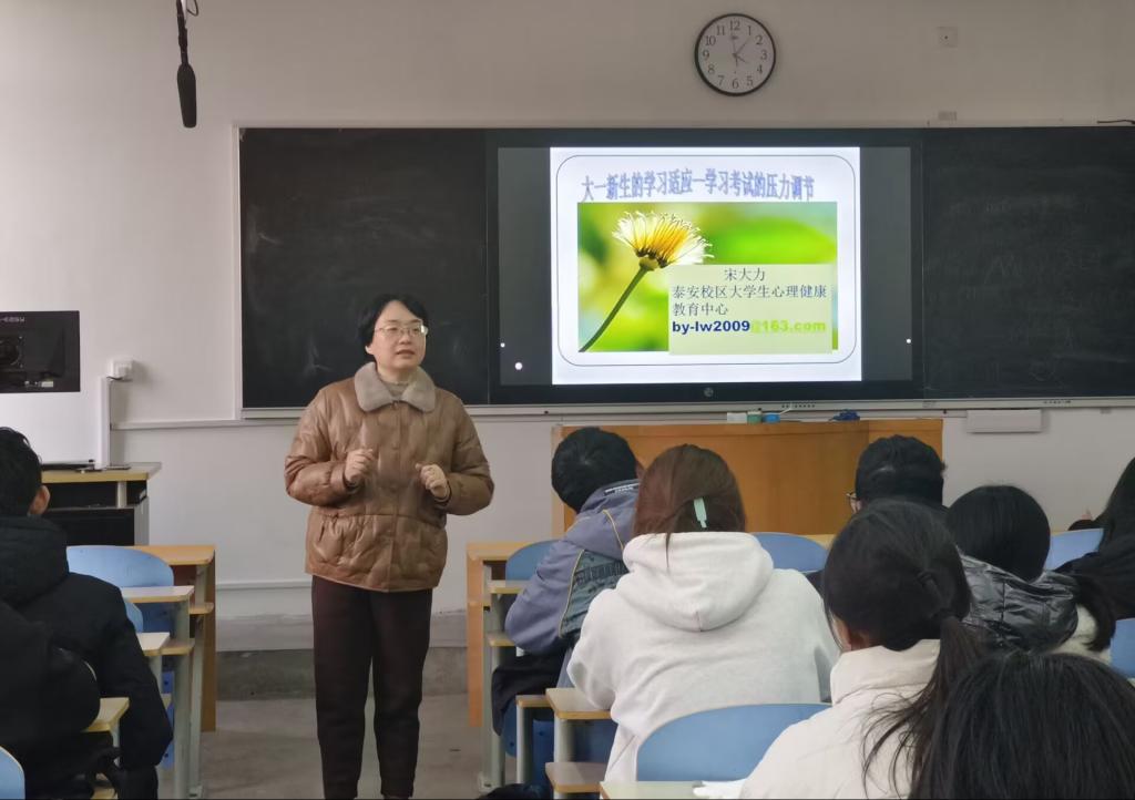 宋大力围绕着“学习适应和考试压力的心理调节”这一主题,展开了深入浅出的讲解。她首先分析了当前大学生入学以来遇到的各种迷茫和困惑,特别是大学生活中的学习与中学阶段学习的不同之处,并针对大学生活中如何学会适应、如何调整心态等问题给出了建议。宋大力还向同学们分享了如何激发学习动力、如何有效应对考试压力的实用技巧和方法,她指出:“考试是平常的事,焦虑是自然的事,用认真地准备迎接挑战,以平和的心态面对结果”。