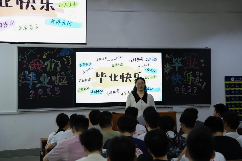 午后14:00,教室里,孙丽带领学生开展充满回忆与温情的班会。她与学生回顾军训、运动会、课堂等难忘瞬间,引发大家的情感共鸣。临近尾声,她目光温柔而坚定:“未来或有风雨,但请记得保持热爱,脚踏实地。无论何时,母校永远是你们的后盾。”这是她陪伴学生在校的最后一次班会,是装满殷切期许,成为镌刻在青春里最珍贵的大学“最后一课”。