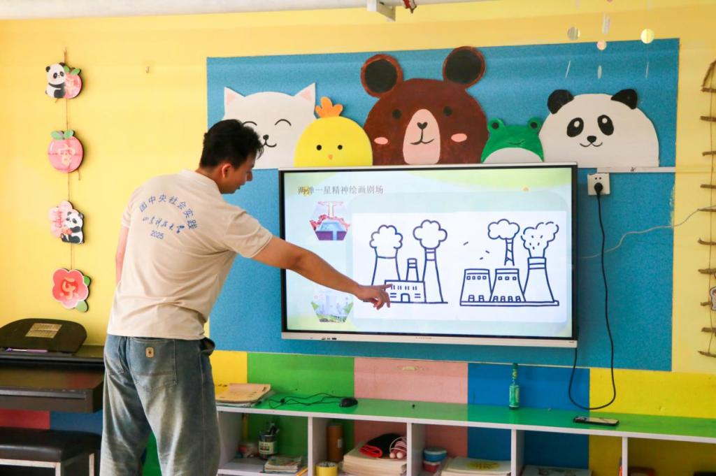 团队立足团中央立项及活动开展要求,精心准备、精益求精。团队成员们精心梳理活动器材、准备各类教学物资、道具;熟练掌握团中央宣讲内容,精心备课。大家以生动形象、易于幼儿理解的方式,开展“两弹一星”爱国主义教育、开展核普及宣讲活动。在认识防核辐射物品的环节,孩子们通过贴贴纸的游戏,认识到生活中如铅衣、含碘食物等具有防核辐射作用的物品,孩子们玩得开心,又学到了知识。活动最后,实践团队还带领孩子们画核电站简笔画,引导孩子们充分发挥想象力,用画笔描绘出自己心中的核电站模样,将“两弹一星”精神的种子播撒在孩子们心间,为他们注入了爱国和探索的力量。