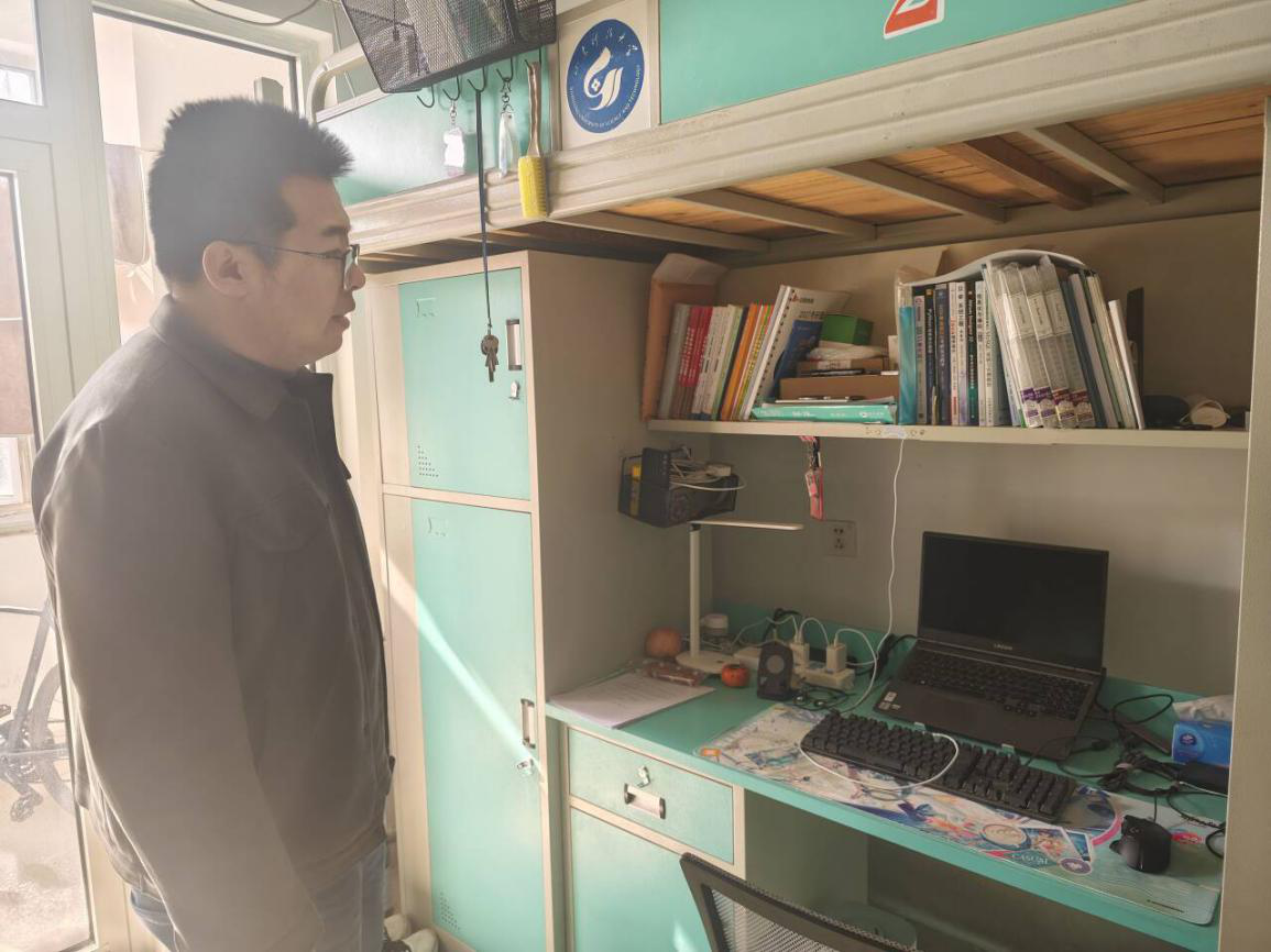 天光微亮,秦泽川来到毕业班宿舍,按照日常管理要求逐间检查宿舍情况。他重点查看内务整理是否到位、公共区域是否整洁、插排和电器使用是否规范。对于部分宿舍存在的插座过载、物品摆放混乱等情况,他现场记录,并准备后续统一提醒。检查结束后,他将需要跟进的问题单独列出,便于之后逐项落实。