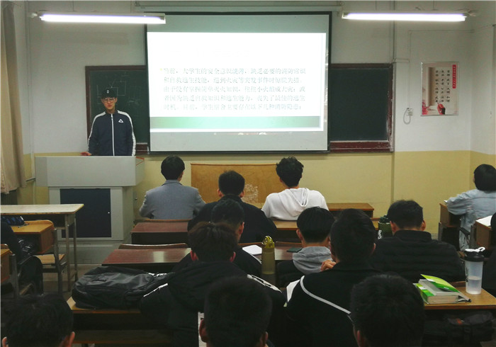会上,孙怀鹏结合“宿舍安全的重要性”、“宿舍常见的几种安全隐患”、“校园火灾案例”三个方面,与同学们进行了深入的探讨。孙怀鹏说:“近期校园内部分场地施工,外来人员较多,危险性较高。召开此次主题班会的目的是希望能够引起同学们的重视,让宿舍安全深入人心。”(文/图: 孙玉先)