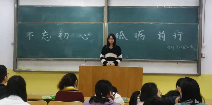 各团支部提前准备活动内容,围绕活动主题展开交流讨论,活动分为“团员的初心是什么”、“团支部成长以及工作总结”、“谈谈我的理想与大学规划”三个环节。首先,各团支部成员依次上台畅谈自己对“团员初心的理解”。金融19-2班团支书王雅煊向同学们介绍了中国共产党的初心,介绍了共青团员的权力与义务。他说,作为党的助手和后备军,要以共青团员身份严格要求自己,勤奋学习,踏实努力,听党话,跟党走,牢记自己的初心,为成为国之栋梁而奋斗前行。其次,各团支部总结开学以来的工作,并针对团支部出现的问题进行分析,就下一步的工作提出好的建议。国商19-1班团支书高思聪总结开学以来团支部在学习、班风建设、团支部活动、宿舍成绩、晚自习纪律等方面工作,重点强调了学生遵规守纪、班风、学风的重要性,明确各团干部、班干部的分工,呼吁大家要为建设努力拼搏团结和谐的团支部而努力奋斗。最后,各团支部成员分享了各自的理想与大学规划。金融19-2班团支部副书记戴溢潇谈到,他要在大学时代,认真学习,踏实勤奋,努力创新,开拓思维,乐于助人,积极为班级服务,努力争做新时代优秀青年,不浪费青春时光,为祖国未来的美好建设添砖加瓦。