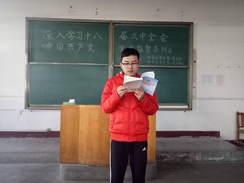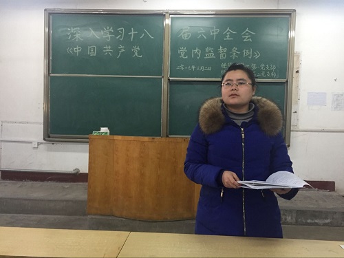 会上,张燕老师强调和布置了民主评议党员的相关工作,做出了近期党员活动安排,同时要求党员对照党章标准,在政治、品德、学习、生活等方面查找问题与差距,加强对党的理论知识学习,完善自身修养,将十八大相关会议精神落实到组织生活中去。随后,全体党员在刘安梓和蔡甜甜的带领下集中学习了《中国共产党党内监督条例》。
