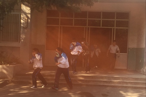同学们首先在1号楼教室集合,随着警报拉响,烟雾扩散开来,同学们用湿毛巾捂住口鼻,有序撤离教室,到操场集合。此次演练,提高了大家的安全防范意识和火灾自救能力,面对险情,同学们临危不乱,做到“跑得快,跑得了,救得了”。