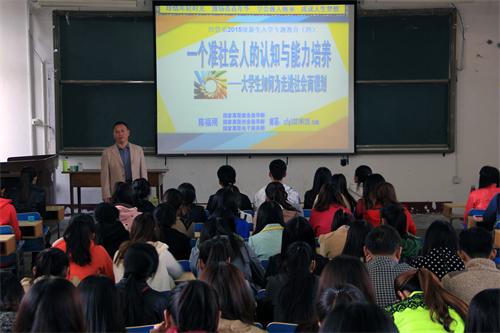 人作为社会的一分子,每时每刻都离不开社会。人的整个一生就是一个不断认识社会、适应环境、走向成功的过程。为了使2015级新生能够尽早地为以后走向社会做好谋划,10月27日,经济管理系党总支副书记、副主任陈福刚特为2015级专本新生做题为“大学生如何为走进社会而谋划”的专题教育。