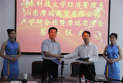 7月8日,经济管理系与山东摩瑞商贸有限公司产学研合作暨摩瑞奖学金设立签字仪式在经管系会议室隆重举行。摩瑞商贸有限公司董事长邓雄、执行总裁高雁、常务副总巩汝贤;经管系党总支书记韦安永、主任周洋、副主任张振华等出席签字仪式。仪式由经管系副主任刘庆志主持。