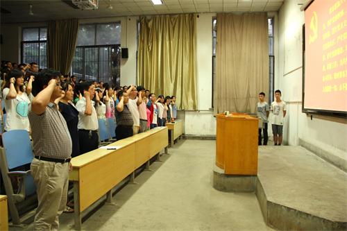 韦安永代表系党总支讲话。他对新加入党员表示热烈的欢迎和衷心的祝贺,对全体党员提出了希望和要求:一、坚定信念,牢记使命;二、加强学习,奉献报国;三、躬身实践,勇于创新;四、名副其实,为党旗争辉。他指出,新老党员要铭记在党旗下立下的誓言,在以后的学习、工作和生活中,用自己的实际行动践行自己的誓言,为实现中华民族伟大复兴的中国梦而努力奋斗!(文:贺同章 图:刘雨)
