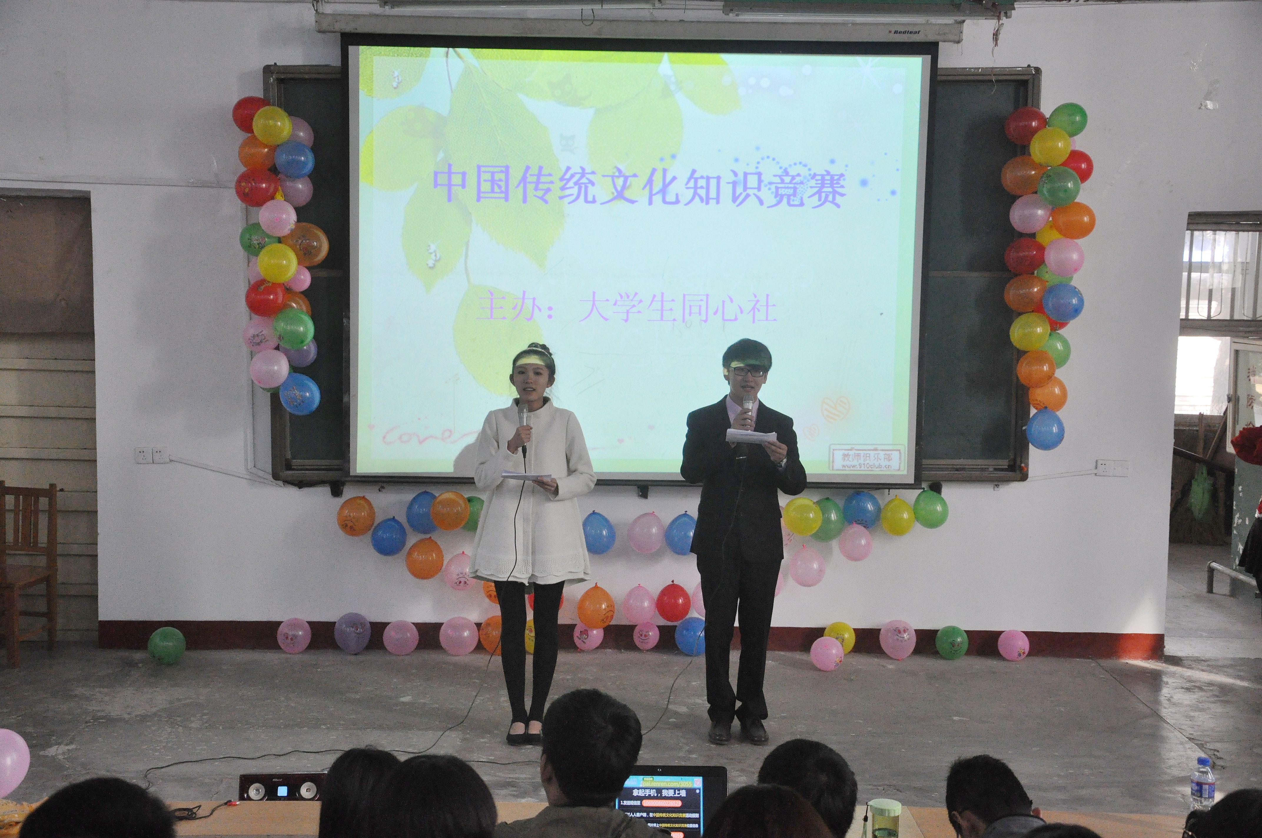 为弘扬中华民族博大精深的传统文化,展现当代大学生积极向上的良好文化风貌,10月20日上午,由经管系团总支主办、经管系大学生同心社承办的传统文化知识竞赛决赛于八角楼隆重举行,此次大赛的评审团由经管系学生会各部主要负责人和系部分协会会长组成。参加此次竞赛的八支队伍是经过初试的严格筛选脱颖而出的,期待他们在知识竞赛这个舞台上有更加精彩的表现。