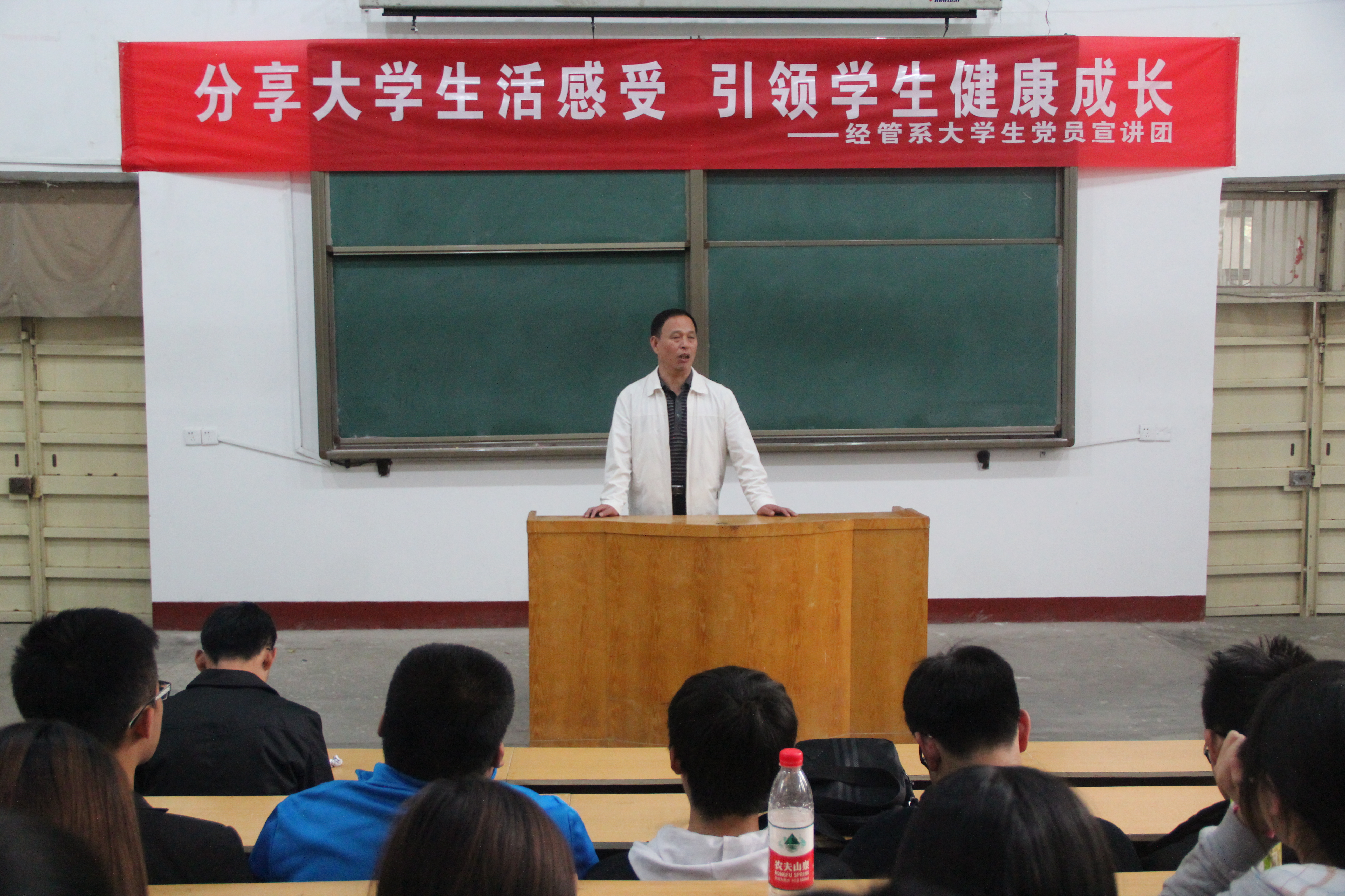 为了深入落实党的群众路线实践教育活动,发挥党员、先进的模范带头作用,使广大经管系学子向更高目标努力,10月18日下午,经管系大学生宣讲团于八角楼召开了“分享大学生生活感受 引领学生健康成长”主题报告会。经管系党总支副书记陈福刚、团总支各学生工作干部出席了此次报告会。