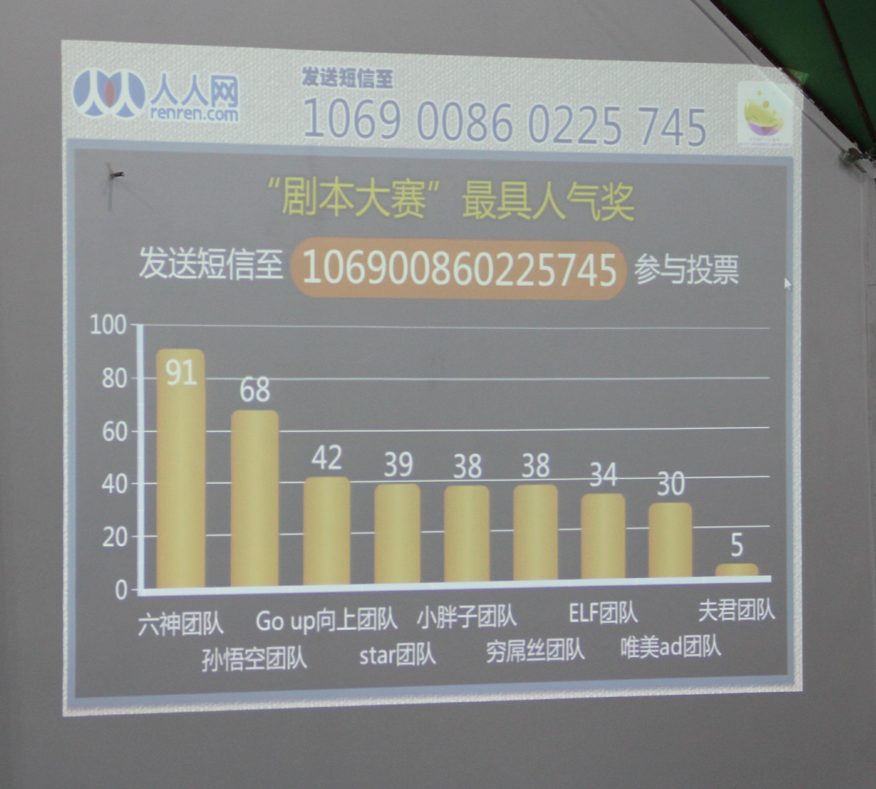 一段热烈激情的开场舞点燃现场气氛,比赛正式拉开帷幕。此次比赛共分为两个环节:精彩亮相和好戏开场。在第一环节“精彩亮相”中,9支参赛队伍一一登台介绍自己的团队成员和组织亮点,每个团队秉持特色,在小小的舞台上释放精彩,展现美丽。他们或表演幽默风趣,令在场观众捧腹;或动作夸张大胆,将即兴表演展示的活灵活现;或语言真挚流畅,胸有成竹,每个队伍出色的自我介绍为即将到来的第二环节增辉添彩。随后进行的是第二环节——好戏开场。在这一环节中,各个参赛队伍施展出自家的浑身解数,一时间剧本争霸,各个参赛队伍创作的剧本贴近生活,贴近实际,真实反映校园生活的苦乐酸甜。其中,“唯美ad”队带来的作品《作弊风波》,将考试中的作弊现象进行现场演绎,成员入木三分的演技令在场观众如临其境,给同学们深深启迪;《唐伯虎点秋香》将古典与现实巧妙结合,为“夫君”队迎来阵阵热烈掌声;《宿舍那点事》反映宿舍成员在交往中遇到的问题和麻烦,并借此表达对友谊的珍视和朋友的珍惜。一波波精妙绝伦的表演将大赛推向高潮,在接近两个小时的现场比拼后,比赛结果在评委公平公正的打分下揭晓,“夫君”队的《唐伯虎点秋香》技压全场,以精湛的演技和完美的团队契合力荣获大赛一等奖;“唯美ad”队的《作弊风波》、“孙吴空”队的《“钱心钱力”为人民服务》、“go up向上”队的《新天下无贼》均或二等奖; “小胖子”队的《校园歌曲大赛》、“穷屌丝”队的《我祖国最牛》等五支代表队的作品获得三等奖;获得“最佳人气奖”的是“六神”队的《宿舍那点事》。最后,大赛在同学们的欢声笑语声落下帷幕。