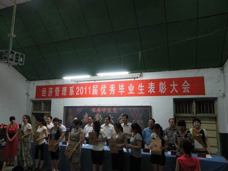 今日学业初成,师恩春风化雨记心底;明朝事业辉煌,母校桃李芬芳竞争荣。6月20日,经济管理系2011届优秀毕业生表彰大会在八角楼召开。经管系党总支书记韦安永,系主任周洋,系党总支副书记、副主任陈福刚,副主任张振华、吴言忠、李军三等出席大会并在主席台就坐。大会由系团总支书记刘凯主持。
