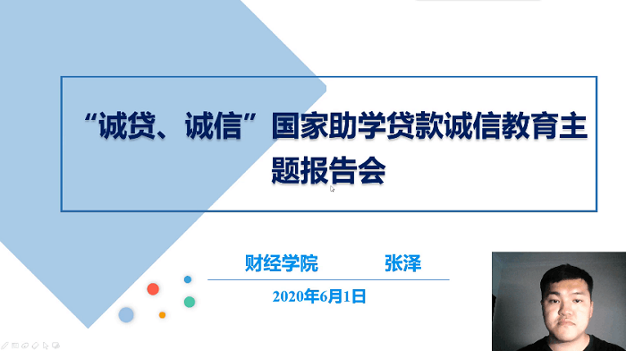 为进一步增强学生诚实守信的责任意识,积极培育社会主义核心价值观,充分发挥资助育人的作用,6月1日,bv伟德国际体育组织开展“诚贷、诚信”国家助学贷款诚信教育线上报告会。财经学院团委辅导员张泽、全体办理助学贷款的毕业生参加了本次报告会。